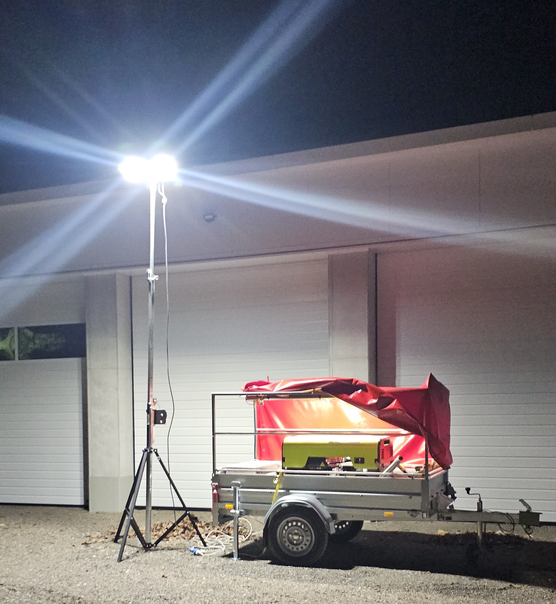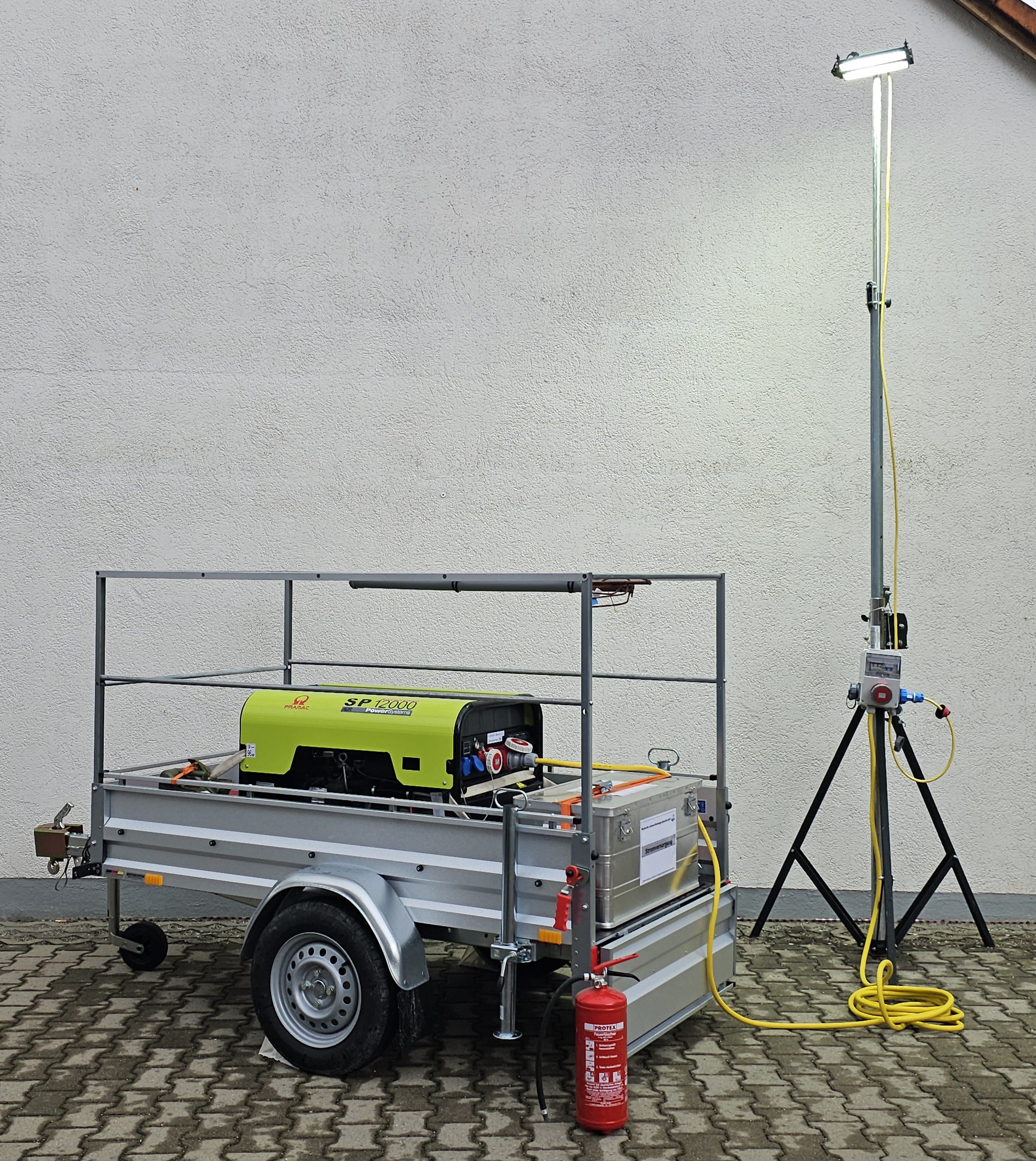 Um dieser Aufgabe gerecht zu werden sind alle unsere Einsatzfahrzeuge mit einem "kleinen" 230V / 2KW Kofferaggregat, einem Lichtstativ und einer